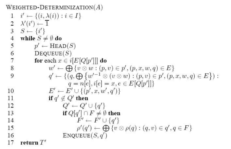 This is an example of what I said earlier regarding WFSTs being an efficient implementation of the algorithms used in ASR. There are several methods to determinize a WFST. One such algorithm is shown below.