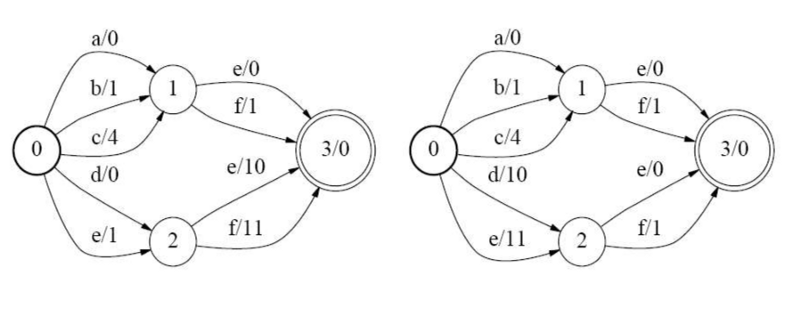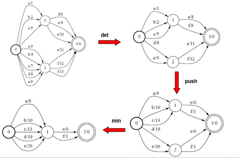 - Weight pushing: All weights are pushed towards the start state. See the following example.