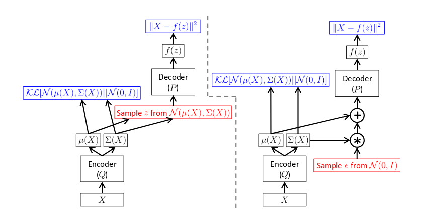 \[z = \mu(X) + \Sigma^{\frac{1}{2}}(X) \epsilon \quad \text{where} \quad \epsilon \sim \mathcal{N}(0,I)\]After this trick, we get the final network as shown in the right in the above figure. Furthermore, we must have $\mathcal{D}_{KL}[Q(z\vert X)\vert \vert P(z\vert X)]$ approximately equal $0$ in the LHS. Since we have taken $Q$ to be a Gaussian, this means that the original density function $f$ should be such that $P(z\vert X)$ is a Gaussian. It turns out that such a function, which maximizes $P(X)$ and satisfies the said criteria, provably exists.