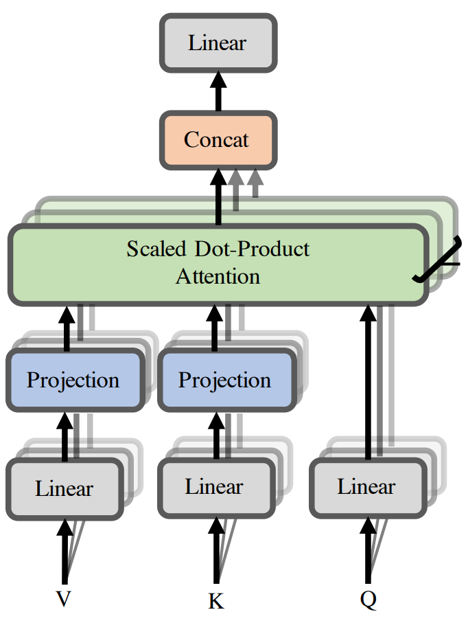 \[SA(Q,K,V) = \text{softmax}\left( \frac{QK^T}{\sqrt{d}} \right)V\]In the above equation, the $SA$ function transformers $Q$, $K$, and $V$ into a sequence of output tokens, say $V’$. We can also write this equivalently as