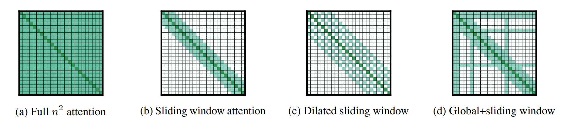 | Longformer | Local-global attention | Window + Task-specific global attention | Original, HuggingFace |
