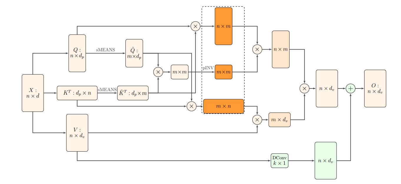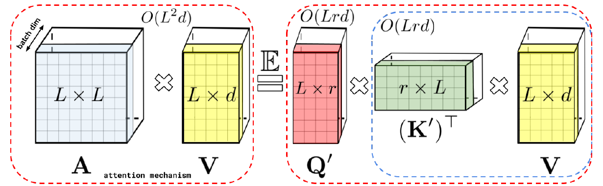 \[\tilde{P} = \begin{bmatrix} A & B\\ F & FA^+B \end{bmatrix} = \begin{bmatrix}A\\F\end{bmatrix} A^{+} \begin{bmatrix}A & B\end{bmatrix},\]where $A$ is an $m\times m$ matrix consisting of $m$ rows of $P$ (where the rows are chosen according to some scheme), and $A^{+}$ is the Moore-Penrose pseudoinverse of $A$. Each of the computations is now with lower-dimensional matrices linear in $n$. However, there is a caveat: to compute $A$, we still need to first compute $P$, because of the softmax operation (elements of $A$ are normalized by the sum of the entire row in $P$). This defeats the purpose of the approximation, since we were doing it in the first place to avoid computing $P$.